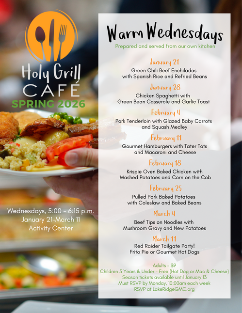 Holy Grill’s purpose is to bring people together and to have community while sharing a meal. This semester, our meals will be "Warm Wednesdays", prepared and served from our own kitchen. All we need is for you to come to the ‘table’. Holy Grill runs on Wednesdays from January 21 to March 11 from 5 – 6:15 in the Activity Center. Adult meals are $9, kids under 5 eat free (hot dog or mac and cheese). Meals are paid for by reservation only and must be purchased by Monday at 10:00am for that Wednesday's meal. Reservations for Holy Grill are on our website under Events.