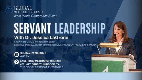 Calling all laity! — Join us on Sunday, February 1, at 4:00 pm, here at LakeRidge Methodist Church in Lubbock, as the West Plains Conference hosts Dr. Jessica LaGrone for a time devoted to learning more about how laity can embrace the role of servant leadership in the church and how God calls each of us to intentionally pour into the lives of others. Don’t miss out on this opportunity to hear from a leading Wesleyan voice in the church today. You will also have the opportunity to hear about the latest developments in the GMC on the global denominational level. The event is free.